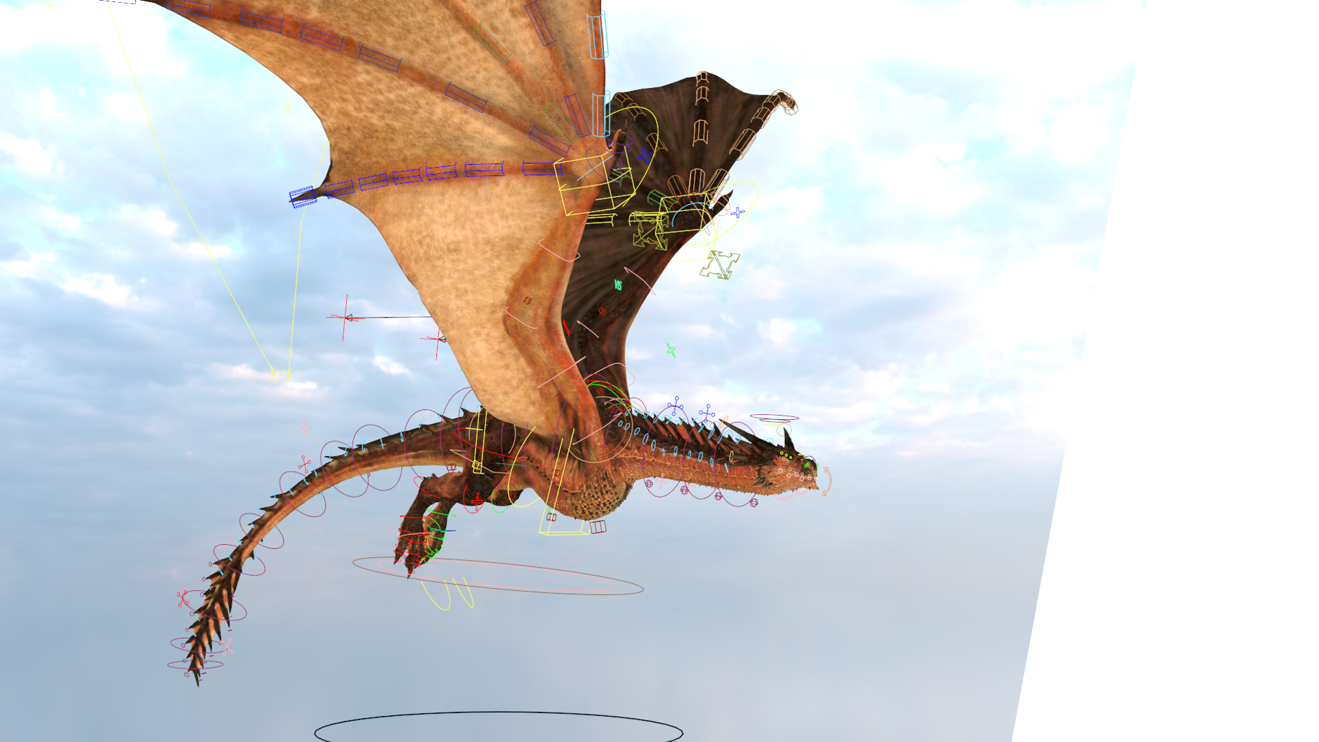 A dragon combines many different elements, making it a particularly complex creature to animate. Creating a convincing pattern of flapping and gliding required careful attention to weight, balance, overlap (especially in the tail) and secondary motion in the wing membranes.